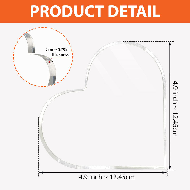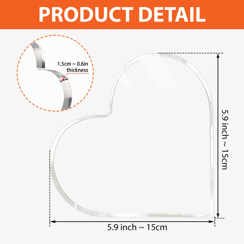 Turn any space of the house: desk, bedroom or workplace into a happy place with a personalized heart shaped plaque. The product is made of sturdy, transparent acrylic that stands up well on flat surfaces. With professional printing technology, your plaque will be protected from scratches and fading for years to come. Personalized plaque is suitable as a gift for your loved ones on special occasions such as Christmas, Birthday, Housewarming, Anniversaries, Mother's Day, Father's Day and so more.